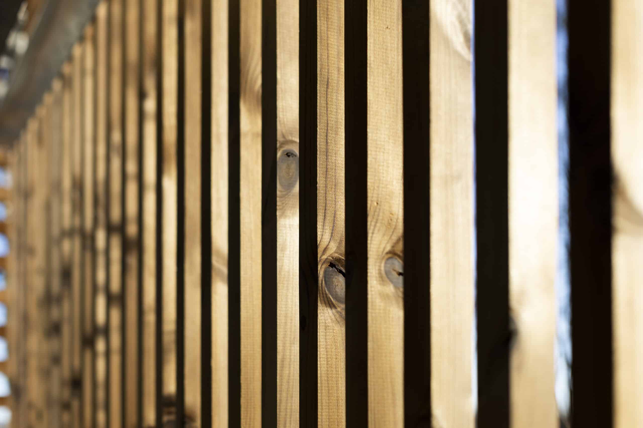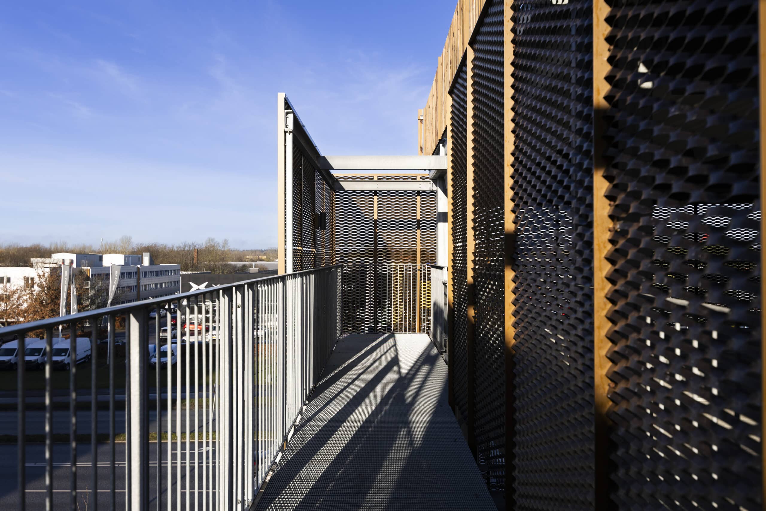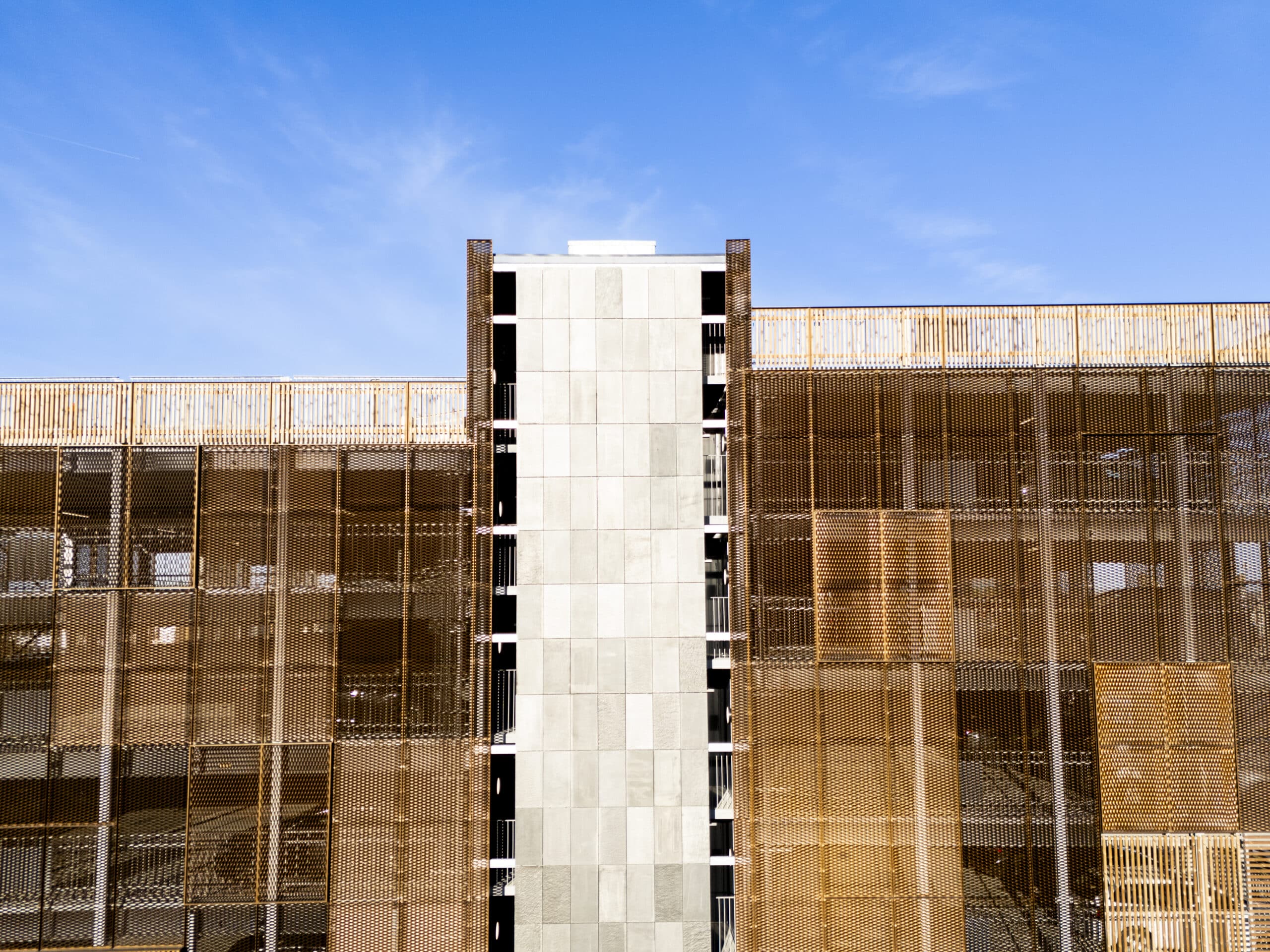 Parkeringshuset er opført med en varieret og levende facade af strækmetal i aluminium, som forskellige klatreplanter med tiden vil vokse op ad. Der er anvendt overskudstræ på dele af facaden og genbrugte naturskiferplader fra den gamle Coop mandskabsbygning, der tidligere stod på grunden. De fire facader varierer, så de passer til de områder, de vender ud mod.